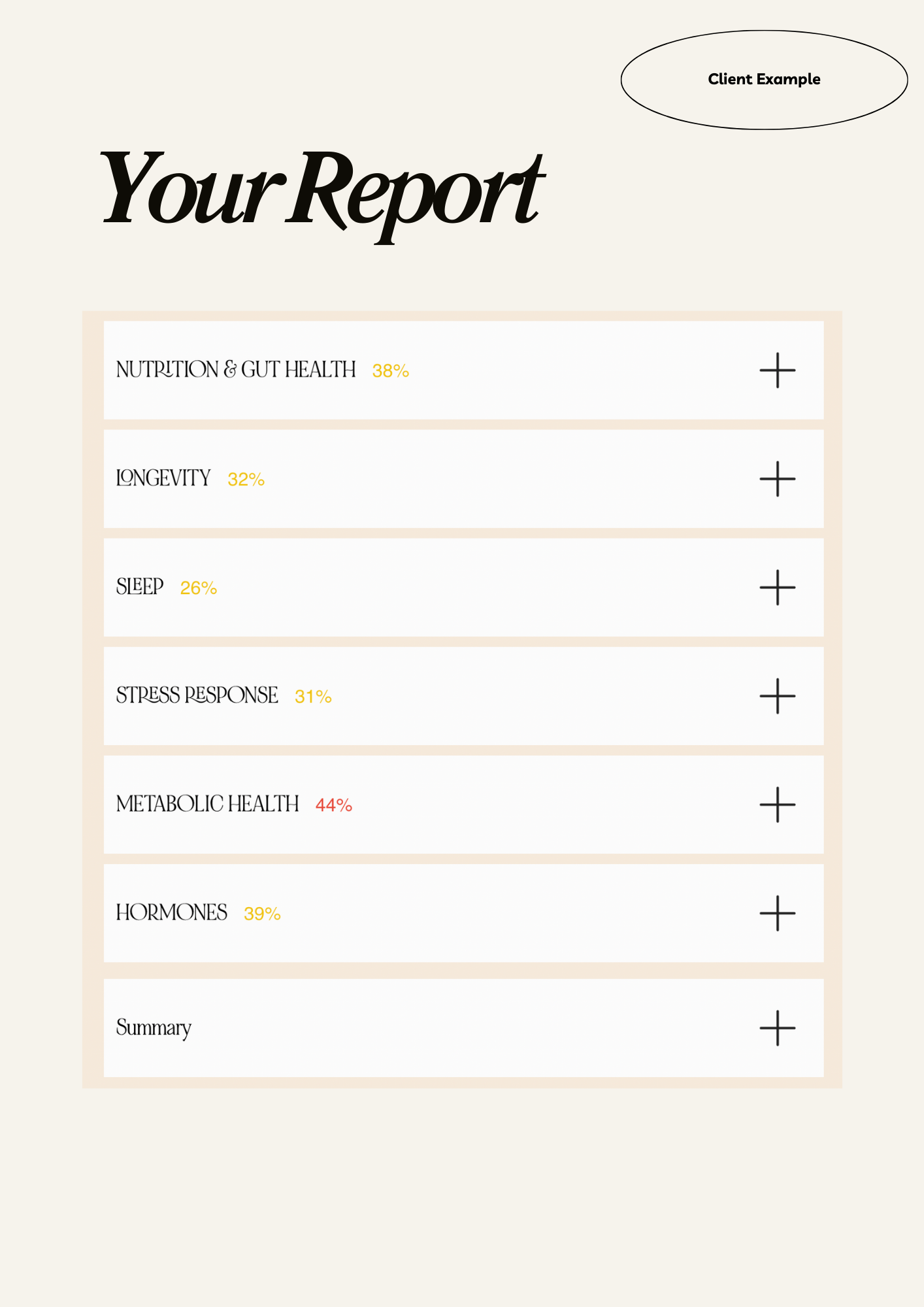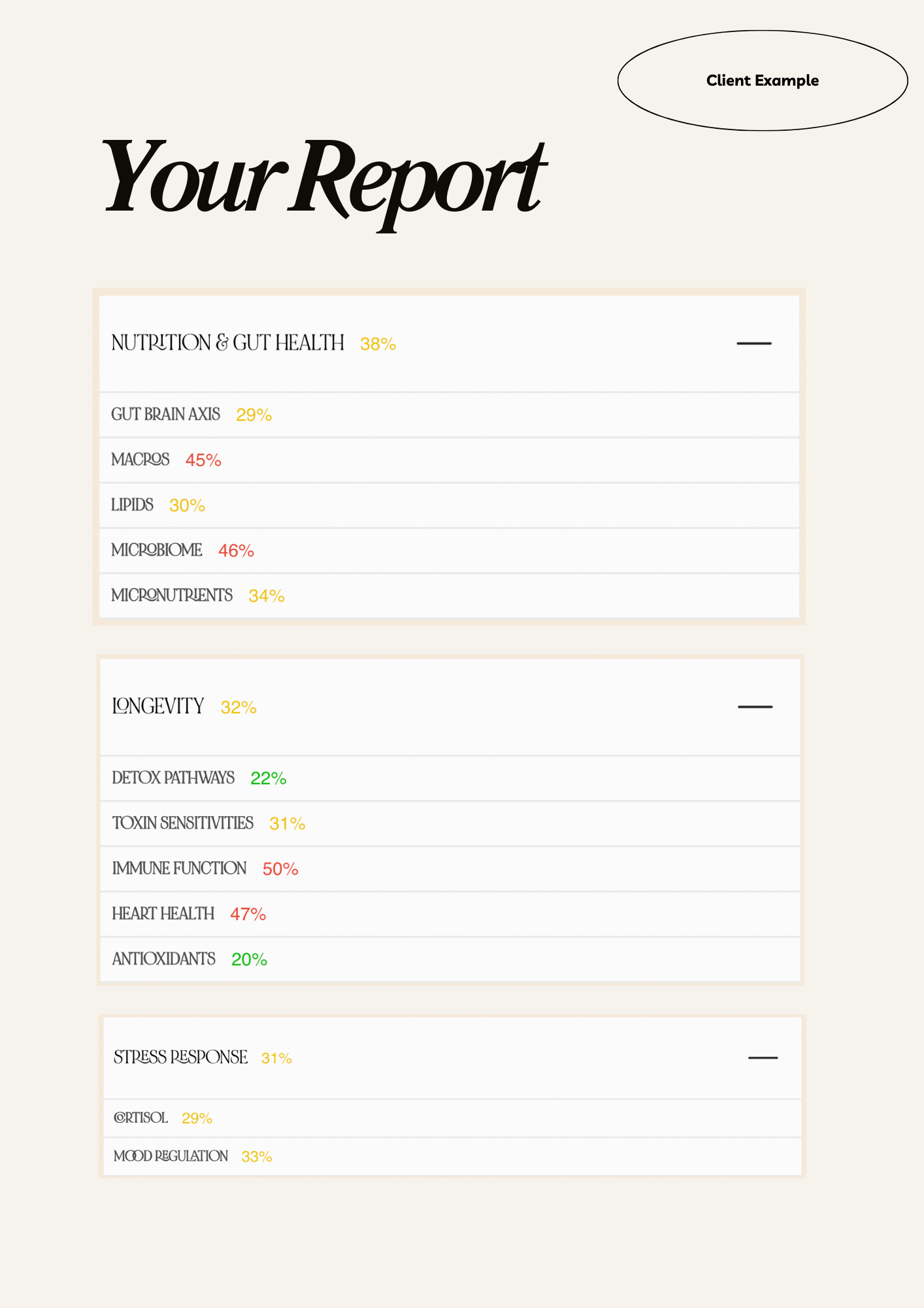 You’ll gain powerful insights into how efficiently your body clears toxins through pathways like methylation, acetylation, and Phase 1 detox, as well as your sensitivity to mold, heavy metals, Lyme, and environmental toxins exposures. We also assess key markers for heart health, antioxidant defense, and immune modulation — giving you a precise strategy to reduce chronic stress on the body and extend your healthspan with clarity and confidence. -